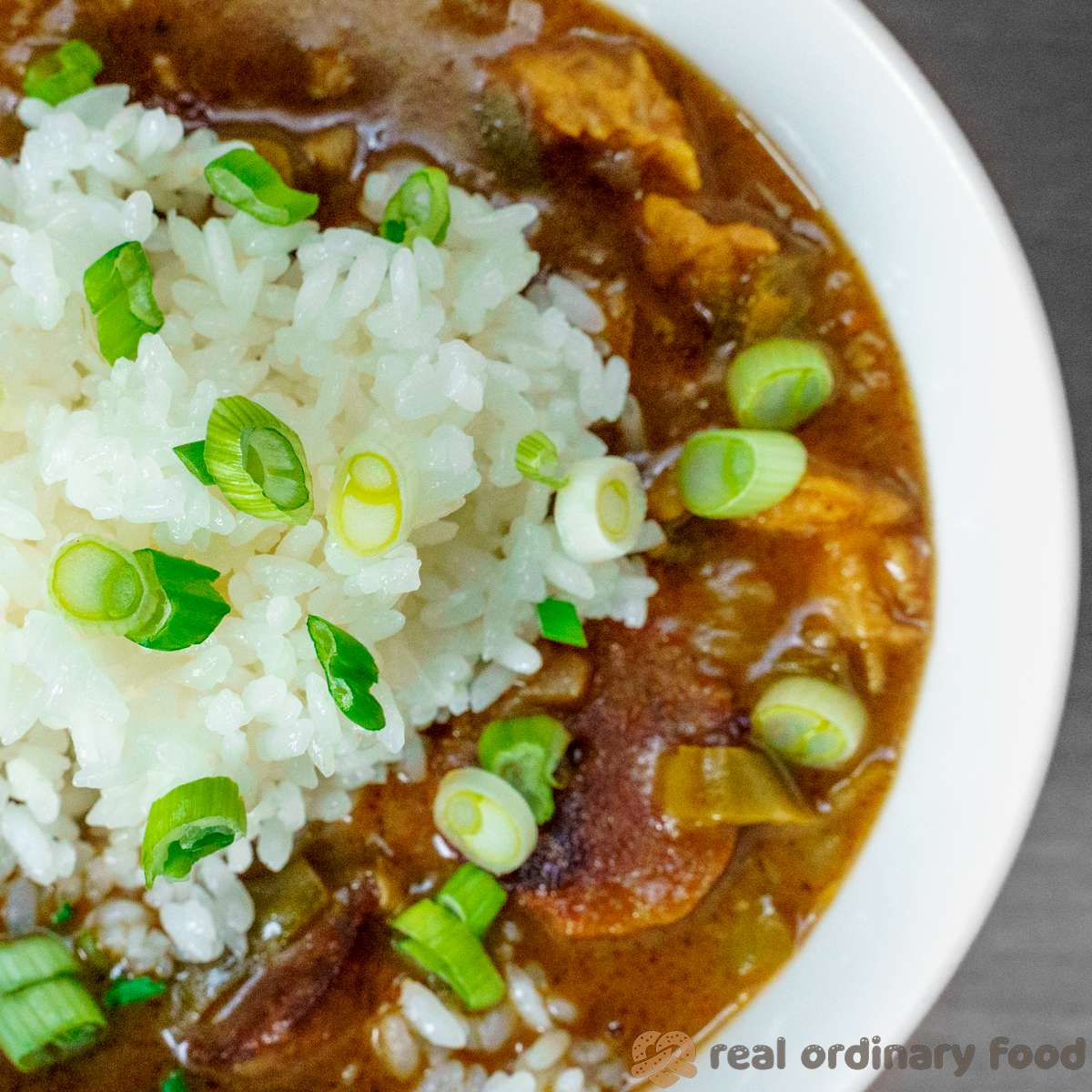 - For the sausage: I use my Vegan Okara Sausage with homemade Andouille spice blend. You can prep these a day or two before. Please don't add the sausage until the very end of cooking; prolonged simmering will cause the sausage to become mushy and it will even start to fall apart into the broth.