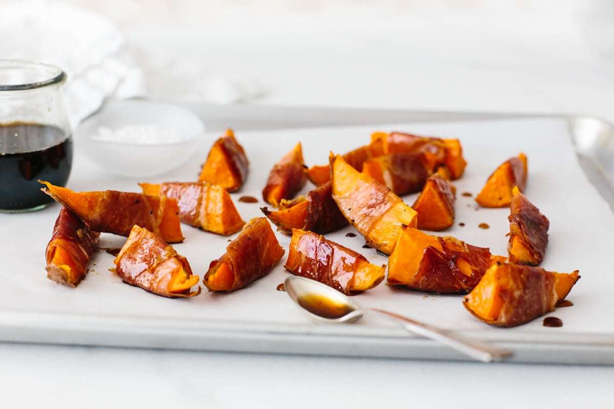Slices of sweet potato wrapped in prosciutto and brushed with a sticky sweet maple balsamic glaze. One of the tastiest appetizer recipes!