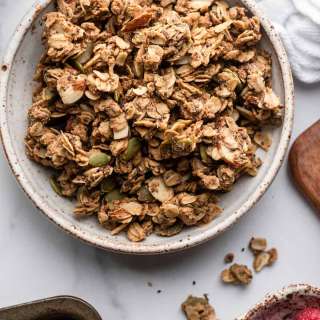 This protein granola is super easy to make and packed with 10 grams of protein per serving! Enjoy it with yogurt or as cereal for a delicious high protein snack or breakfast.