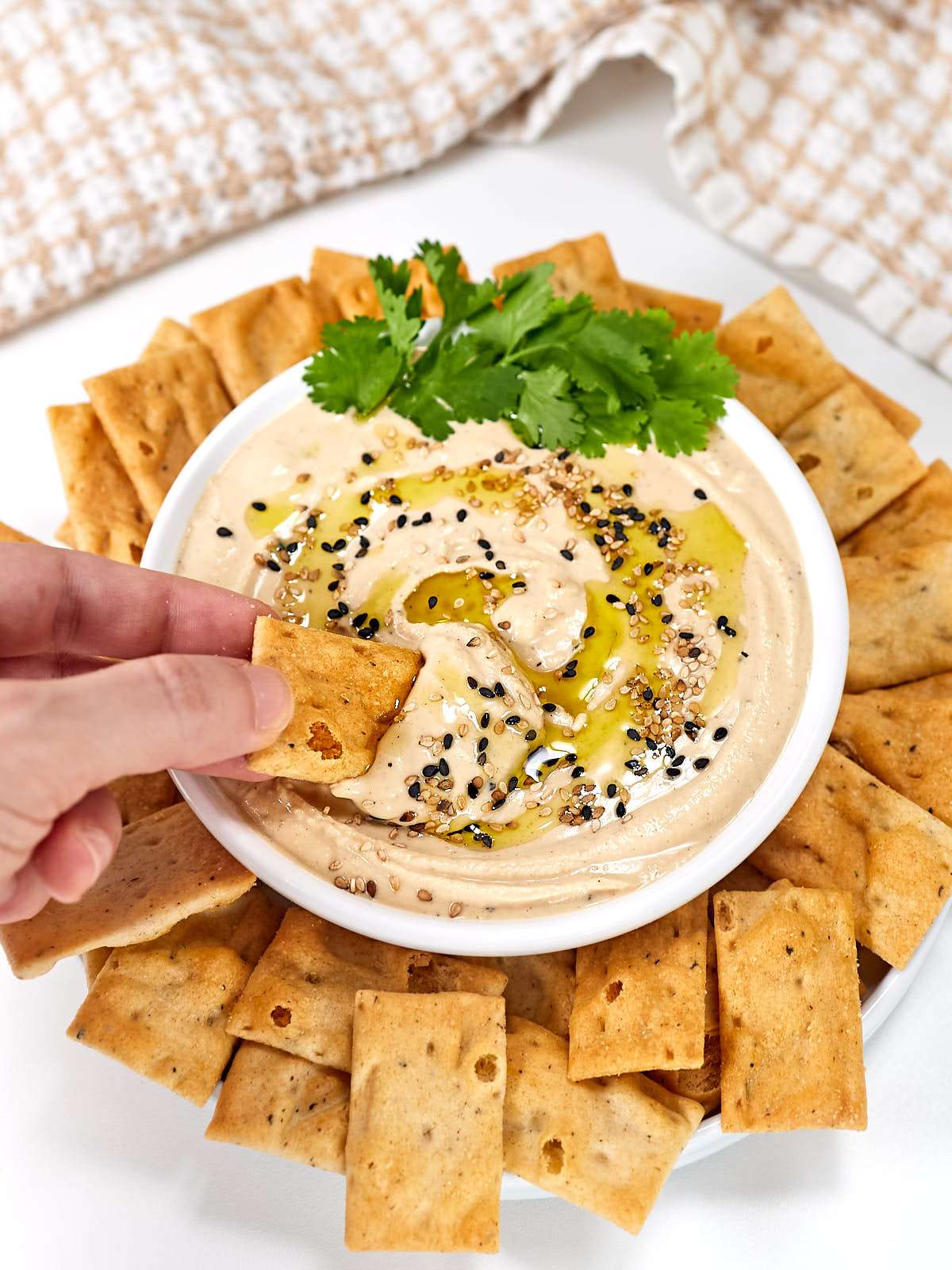 - Slowly add the 1/3 to 1/2 cup water, starting with a small amount. Mix well until smooth, then add more as needed, until the hummus is as thick or thin as you like.