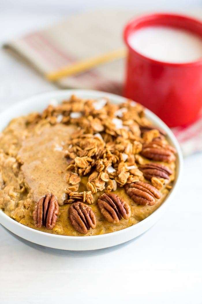 - Once all the liquid is absorbed and the oatmeal is cooked through, place in a bowl and add your favorite toppings. I used almond butter, granola and pecans, but feel free to use a variety of nuts, nut butter or sweeteners. Enjoy!