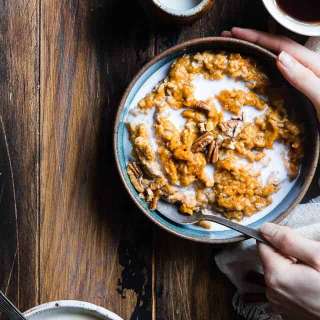 This protein pumpkin oatmeal is loaded with pumpkin flavor and packs 14 grams of protein. The secret is whipping egg whites into the oats while they cook!
