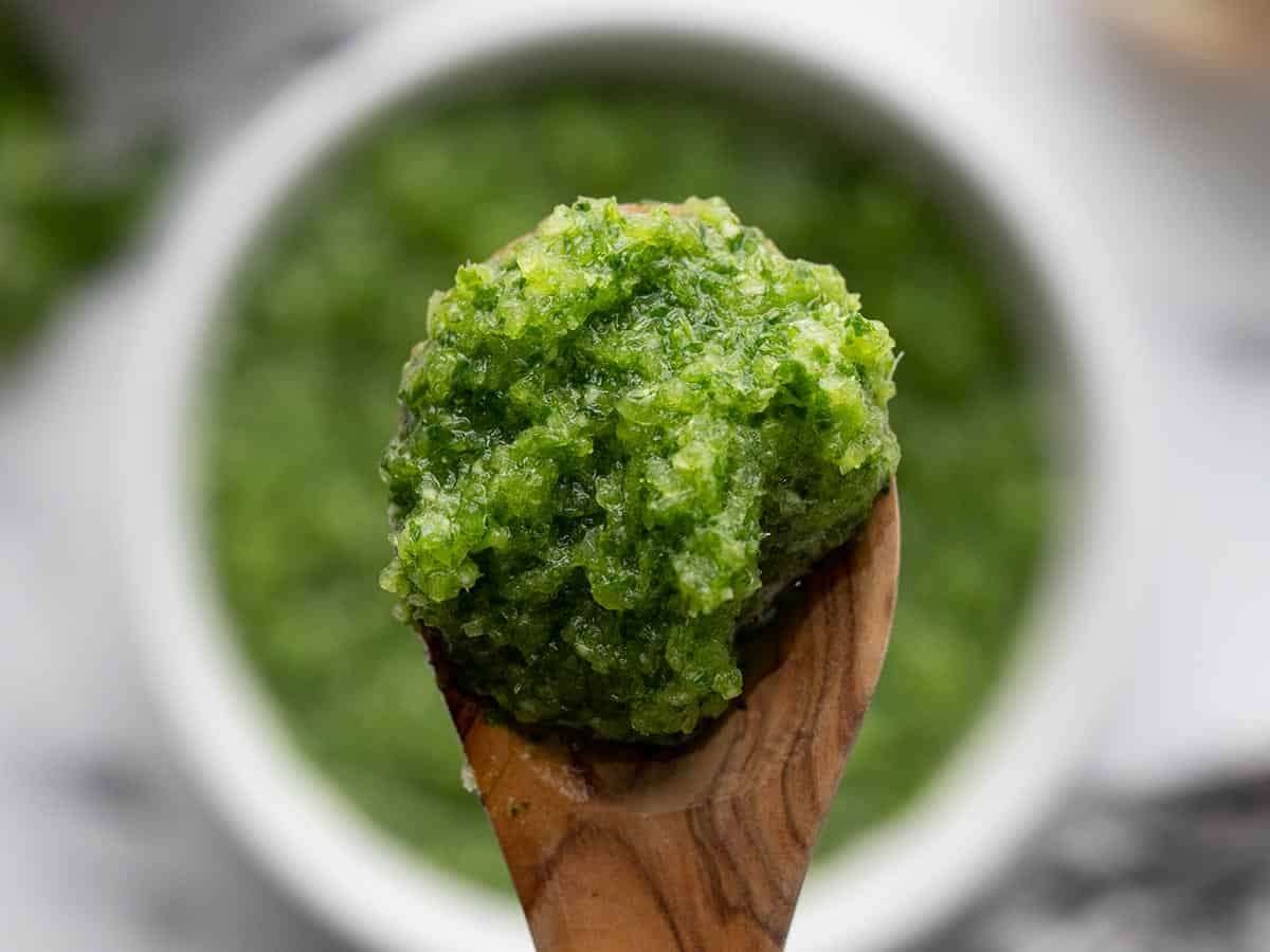 - Add the onion, bell pepper, cilantro, and garlic to the bowl of a food processor. Pulse until a smooth, thick puree forms.