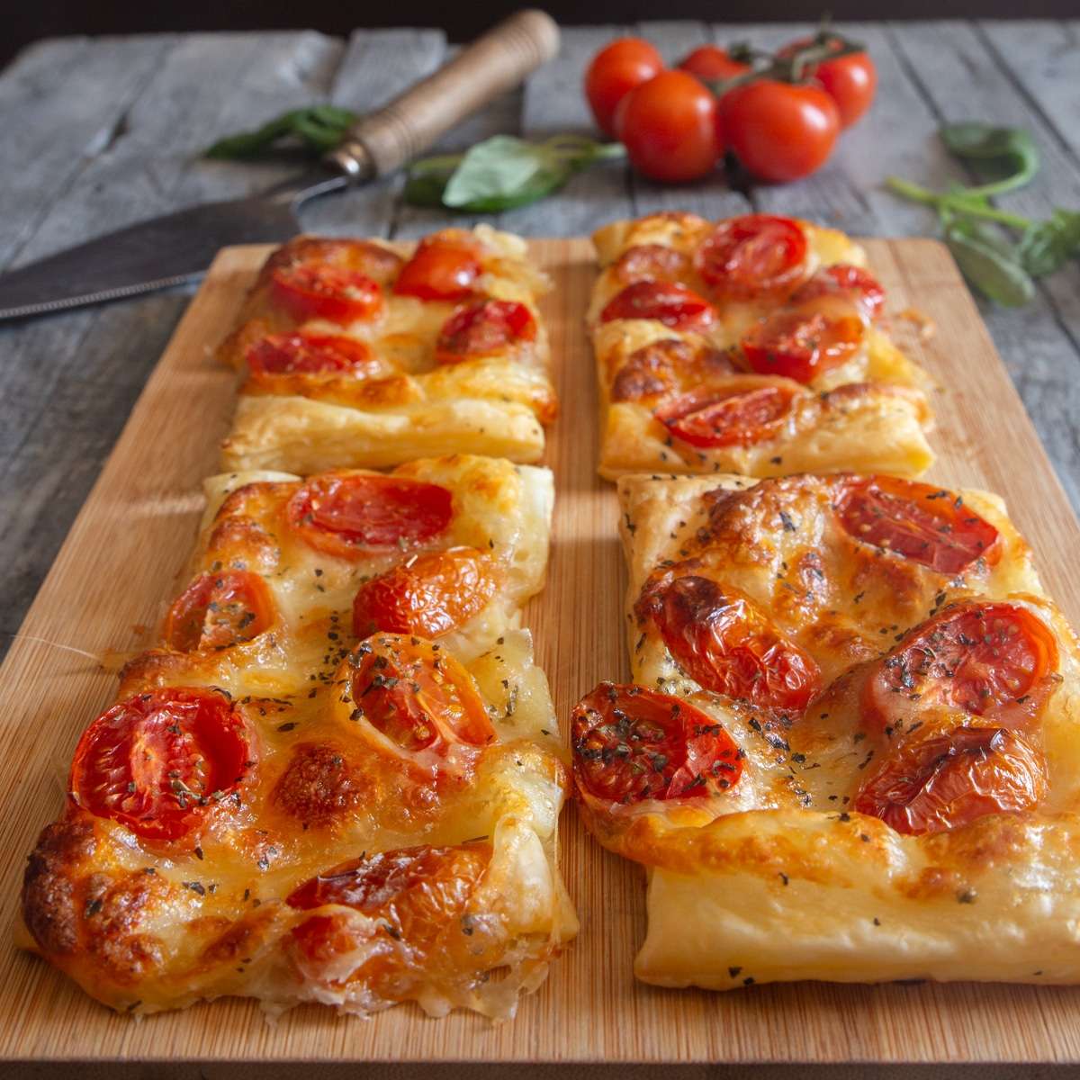 - Place each square on the prepared baking sheet. Top each square with cheese, sliced tomatoes. Sprinkle with salt, oregano and chopped basil. Drizzle with olive oil and bake for approximately 20-25 minutes. Or until golden. Serve warm or room temperature. Enjoy!