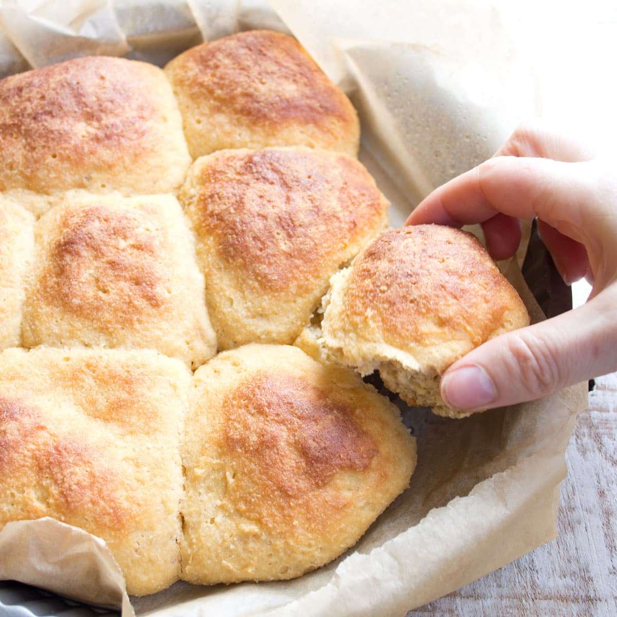 - Line a pie dish or a casserole dish with parchment paper. Lightly wet your hands and form eight dough balls. Make sure you leave some space around the rolls as they will significantly increase in size.
