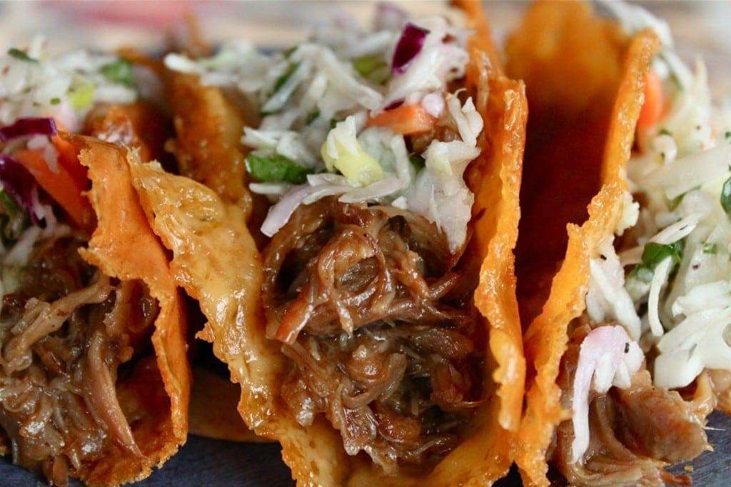 Irresistible Pulled Pork Tacos are made from fall-apart tender pork in a crispy cheese taco shell. Top them off with crunchy coleslaw!