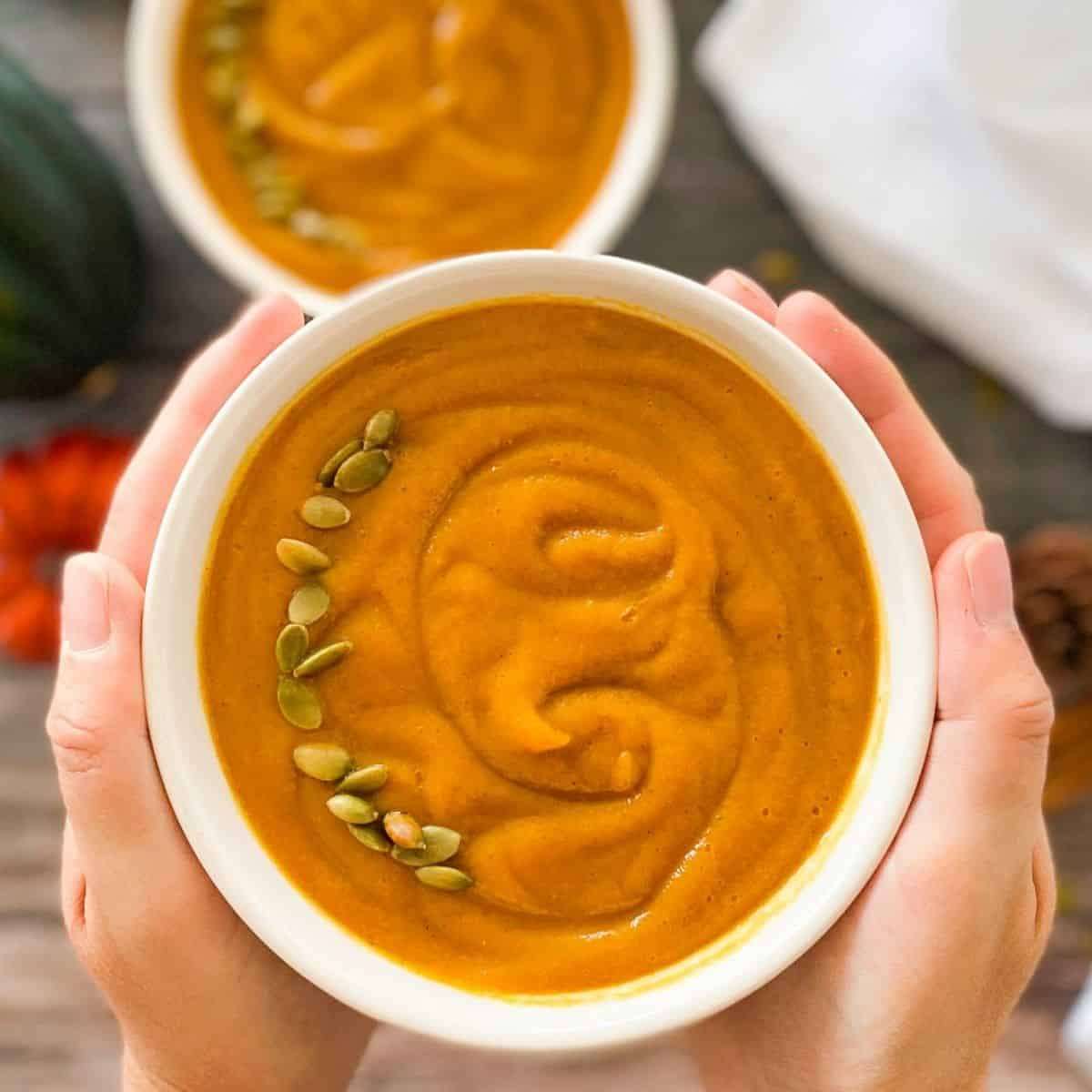 - Using an immersion blender, purée your soup until smooth and creamy. Serve garnished with pumpkin seeds, if desired.