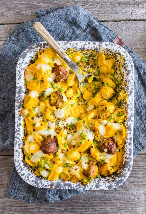 This pumpkin cauliflower alfredo meatball pasta bake is ready in under 30 minutes and packed full of delicious flavor. It's the perfect fall dish and you'll love how easy it is to throw together!