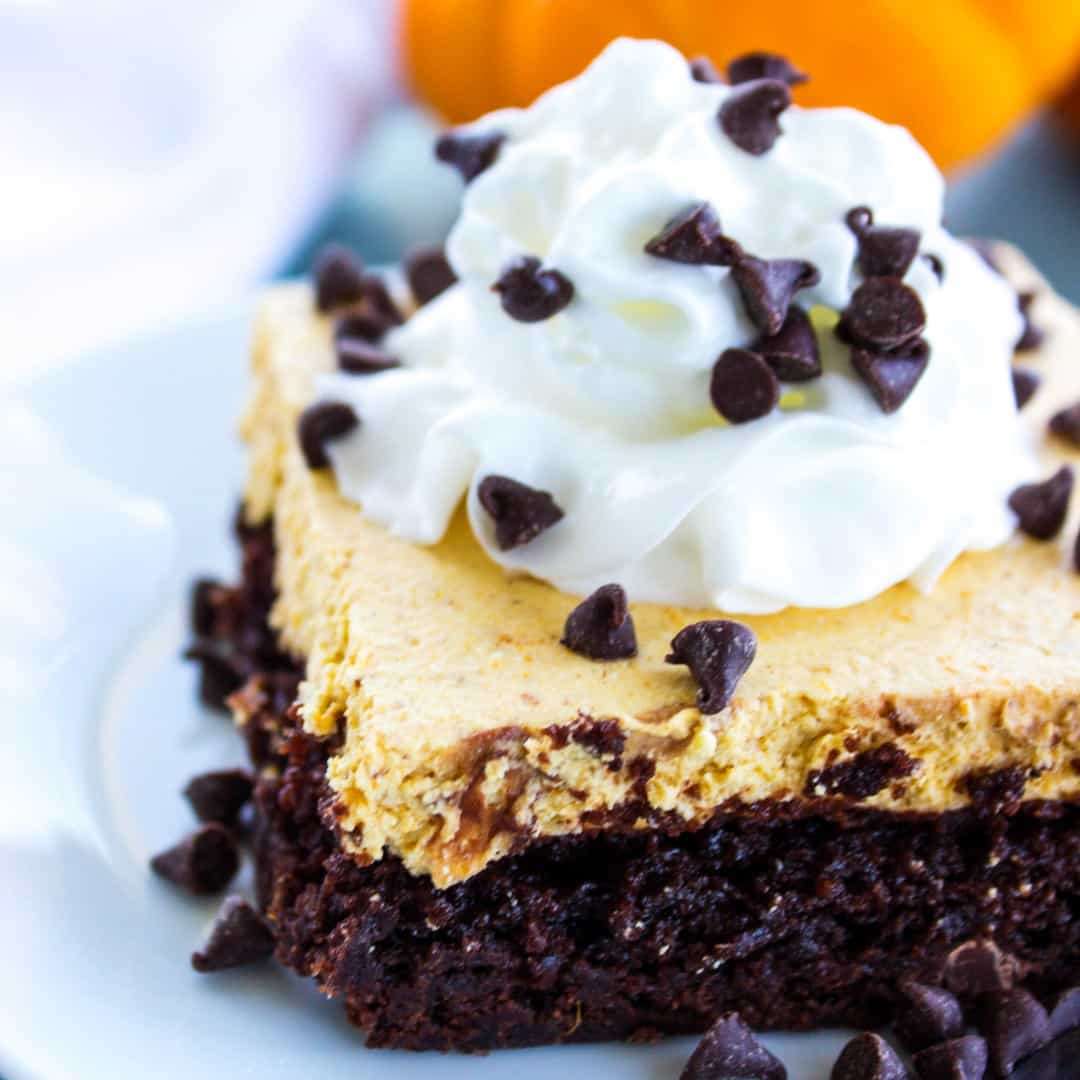 Pumpkin Cheesecake Brownie Bars are topped with a pumpkin no-bake cheesecake then finished off with whipped topping and mini chocolate chips. This is an easy fall must-have!