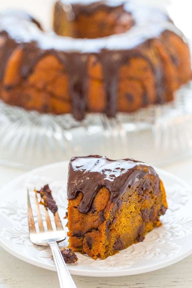 Pumpkin Chocolate Chip Bundt Cake - Fast, EASY, and the moistest pumpkin cake you'll ever taste!! Loaded with chocolate chips in every bite and topped with a heavenly chocolate ganache! Sinfully rich and decadent!!