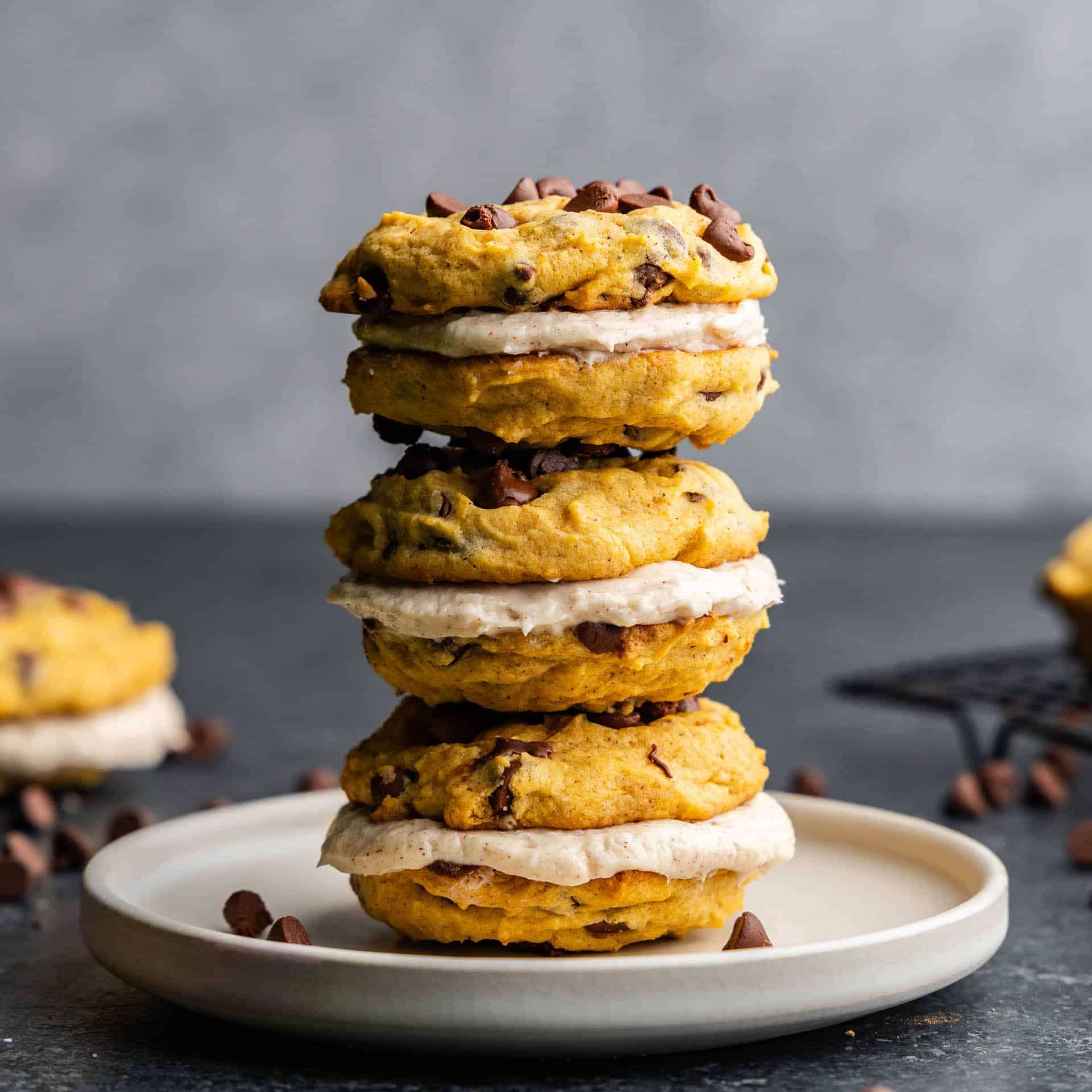 Treat yourself to perfectly soft pumpkin chocolate chip cookies sandwiched with a cinnamon cream cheese frosting. It's pumpkin spice heaven!