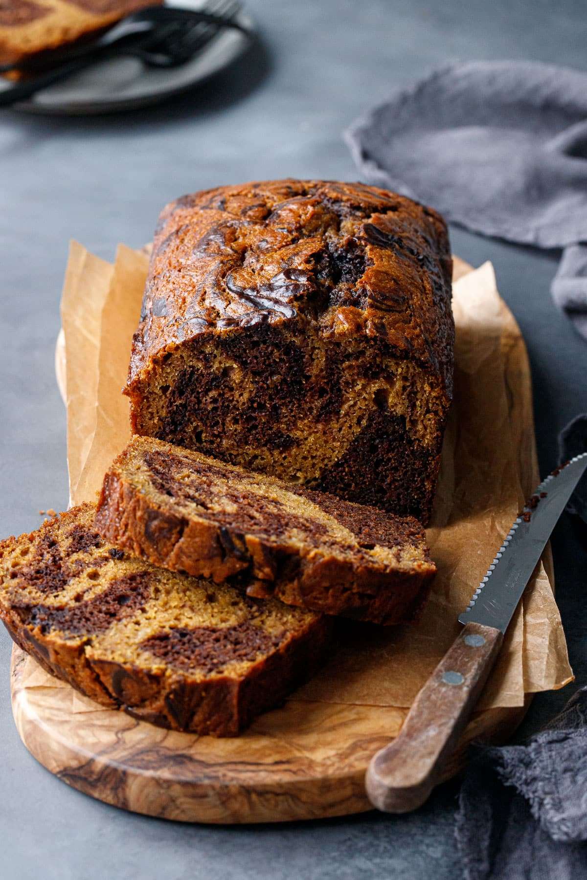 - Use a medium cookie scoop or spoon to scoop batter into prepared pan, alternating dollops of the pumpkin and the chocolate batter in a checkerboard pattern, layering alternate scoops on top of one another about 3 or 4 levels deep. Use a large skewer and swirl the batter, with the skewer touching the bottom of the pan and moving in loose swirling motion to swirl the batter throughout the entire thickness of the loaf.