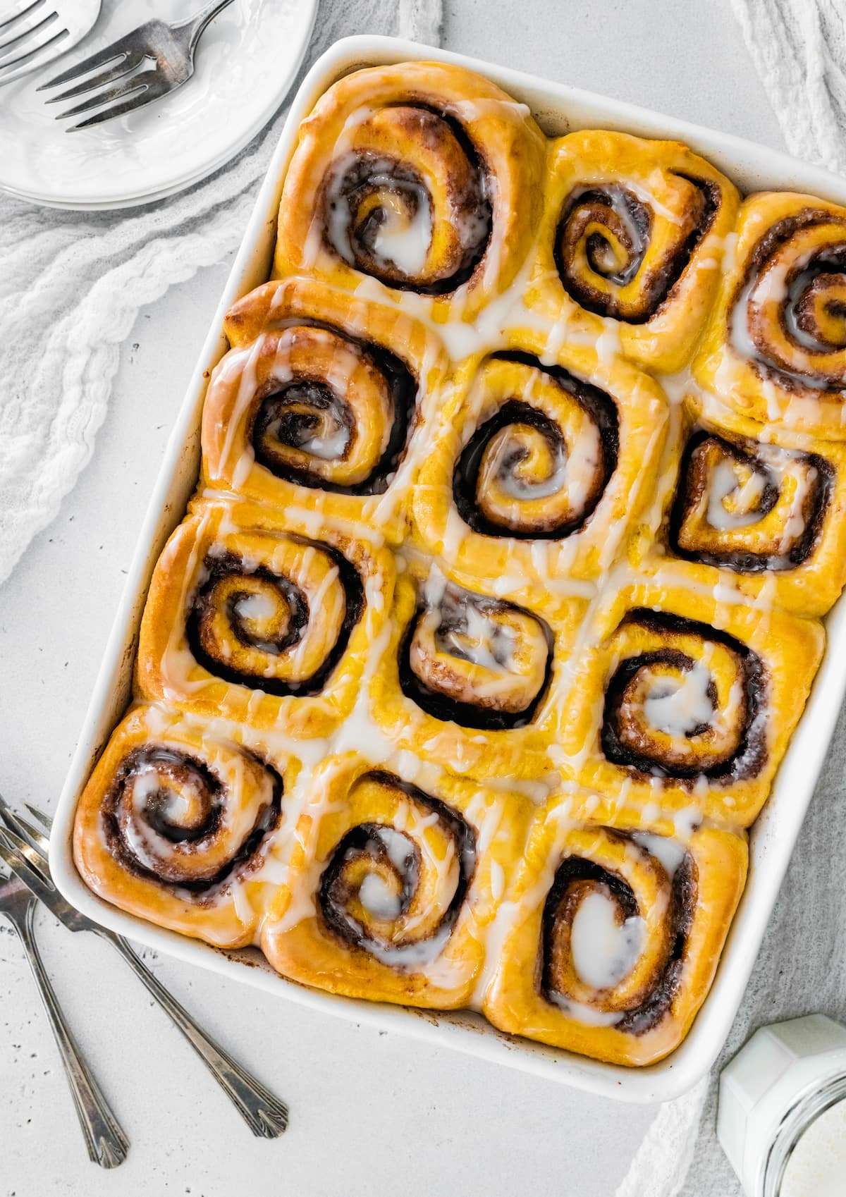 - To make frosting, combine confectioners’ sugar and almond milk in a small bowl. Spread frosting over warm cinnamon rolls and serve.