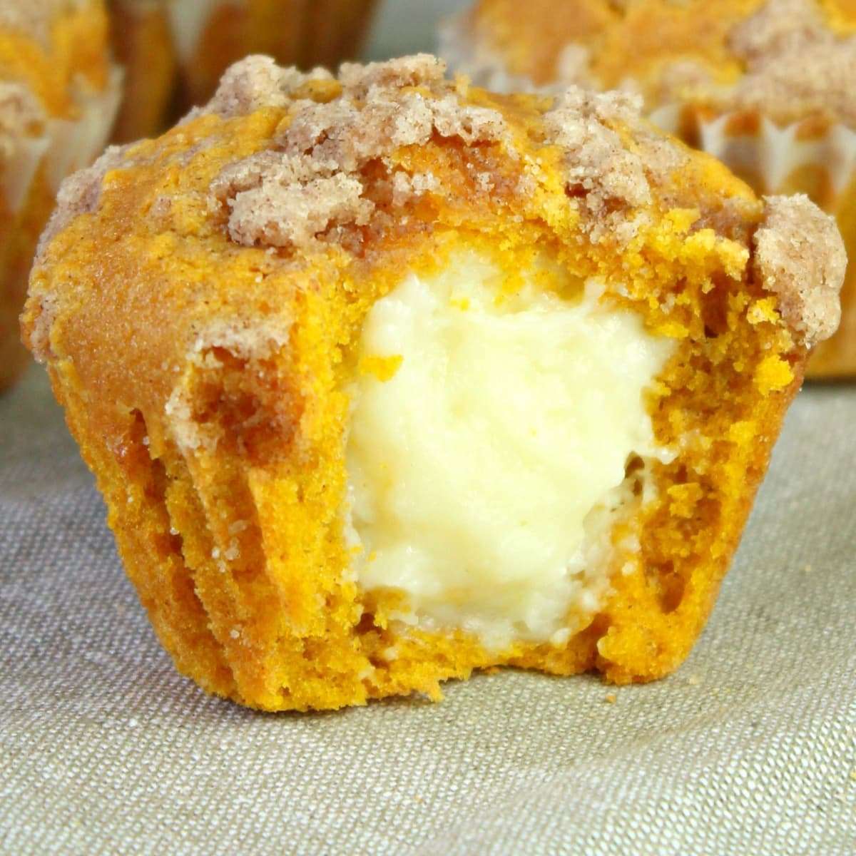 Just like a tasty pumpkin roll, these pumpkin cream cheese muffins blend well-spiced pumpkin muffins with creamy cream cheese filling. Add a crumbly brown sugar topping, and you get delicious pumpkin spice Fall breakfast!
