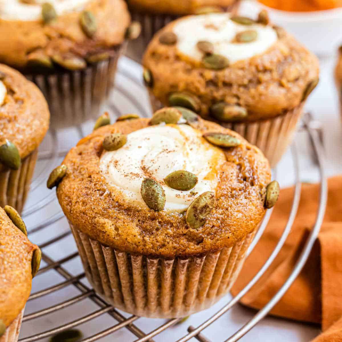 Pumpkin Cream Cheese Muffins are a copycat Starbucks treat. Packed with flavor, these muffins have a sweet cream cheese filling and spiced pumpkin seeds sprinkled on top. Easy to make and freezer friendly!