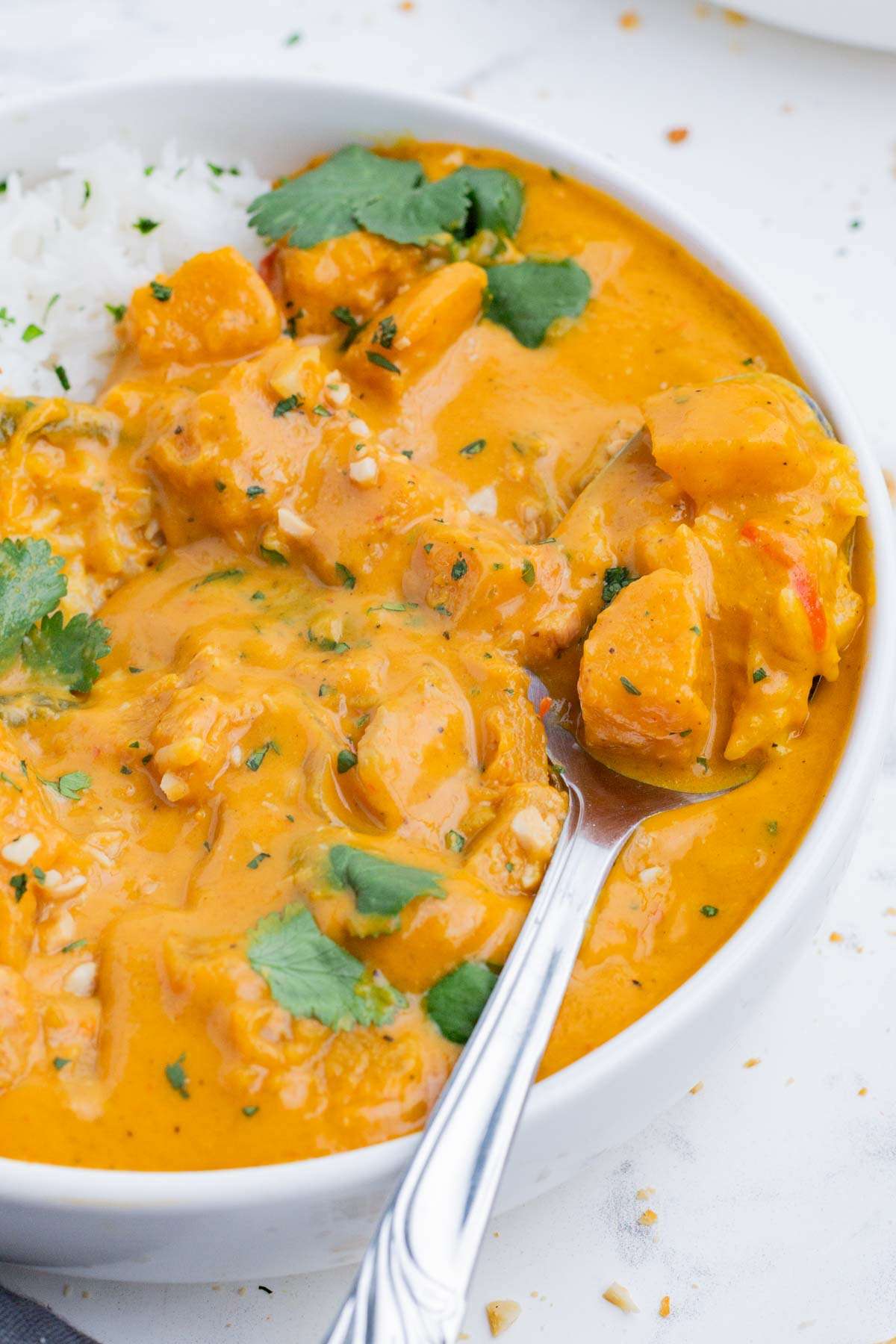- Blend Half and Serve: Remove 2 cups of pumpkin cubes using a slotted spoon and blend what is left in the pot using an immersion blender. (Alternatively, you can transfer what remains into a high-speed blender and puree until smooth.) Add the cubes and peppers back into the pot with the lime juice. Serve the curry over basmati rice and sprinkle with chopped cashews and cilantro.