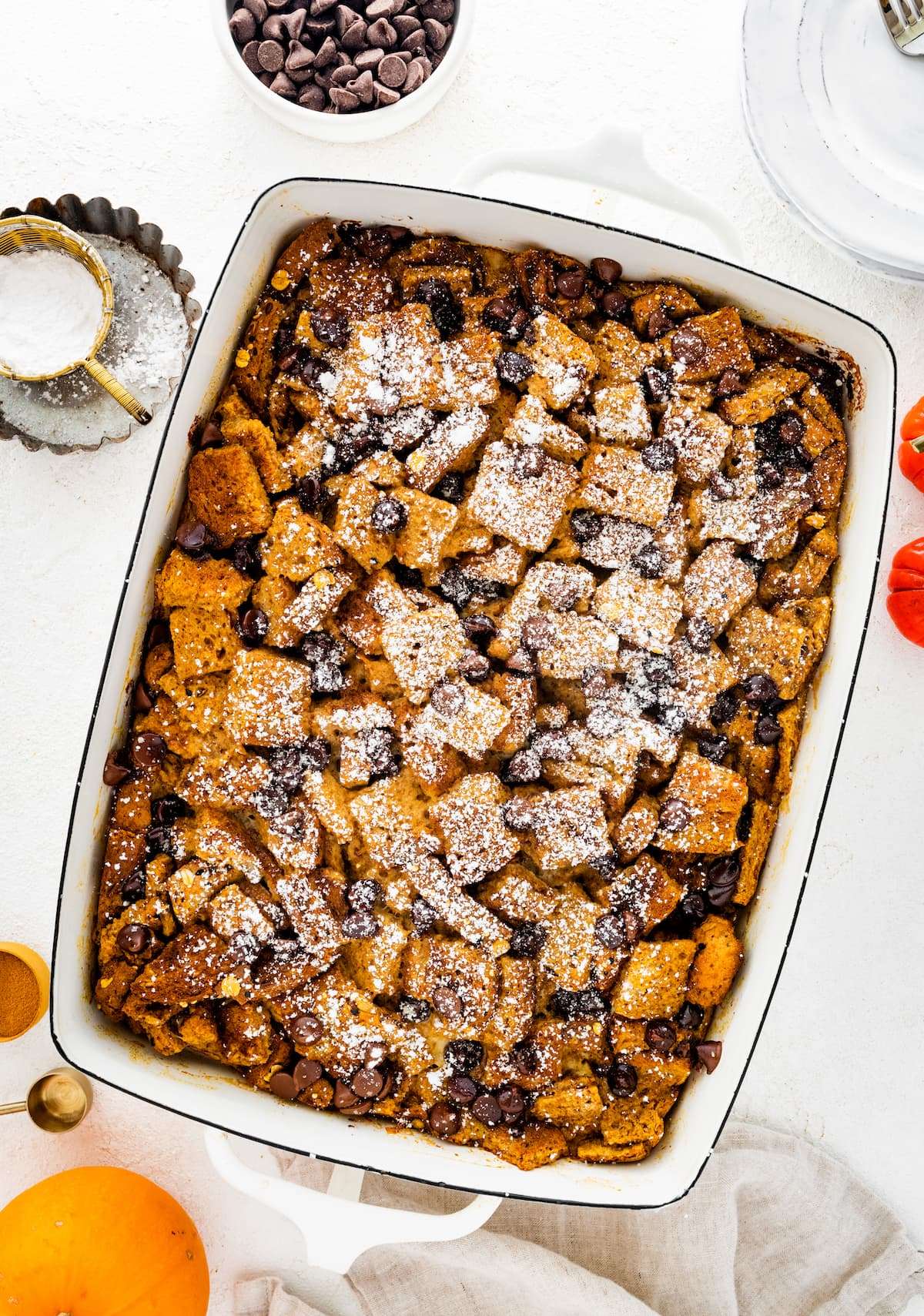 This pumpkin french toast casserole is studded with chocolate chips and packed with fall flavors. It's easy to make, feeds a crowd and can be prepped the night before for a quick breakfast/brunch the next morning.
