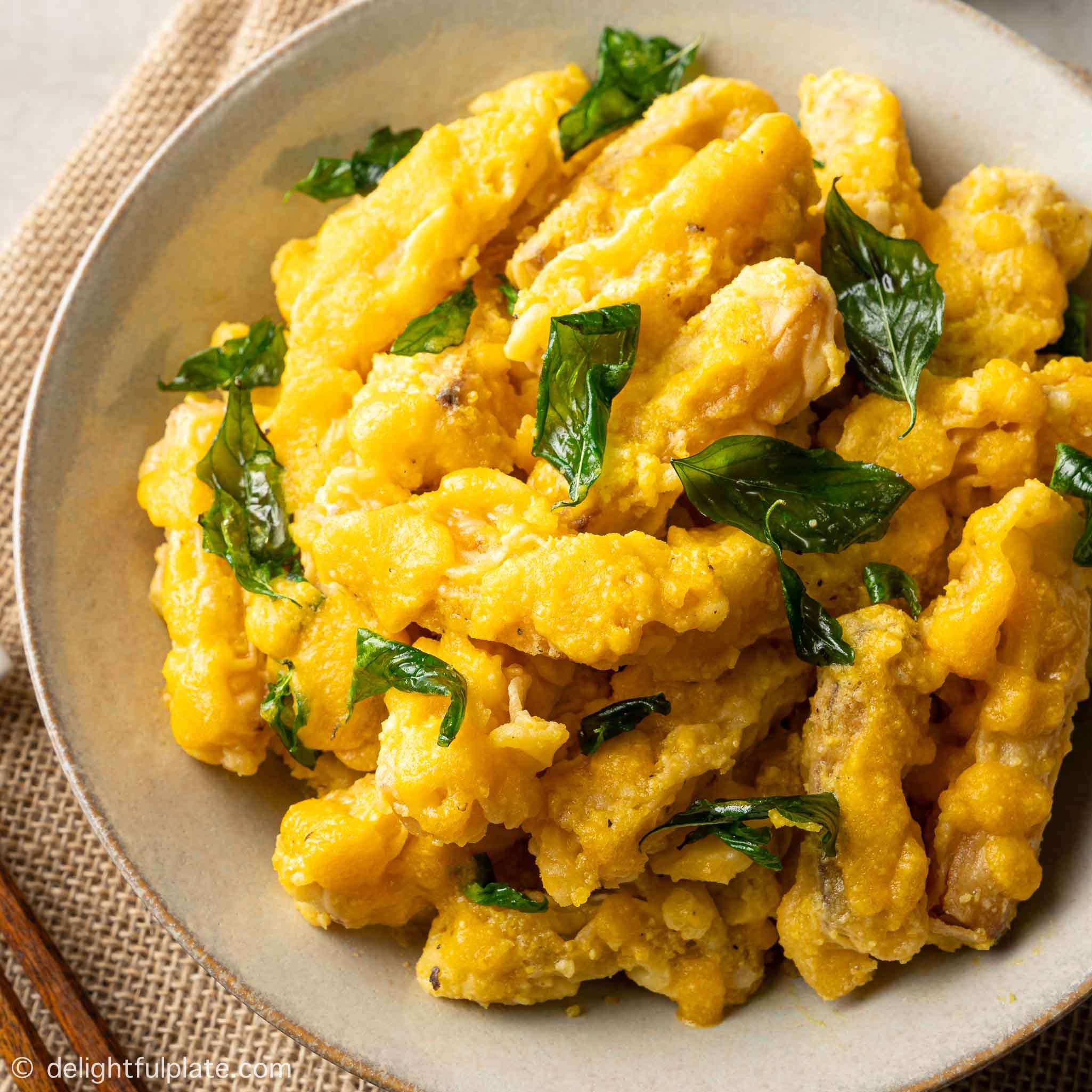 This Pumpkin with Salted Egg Sauce recipe features crispy pumpkin fritters coated with a rich and creamy salted egg yolk sauce. It is a fun appetizer or mid-day snack when winter squash is in season.
