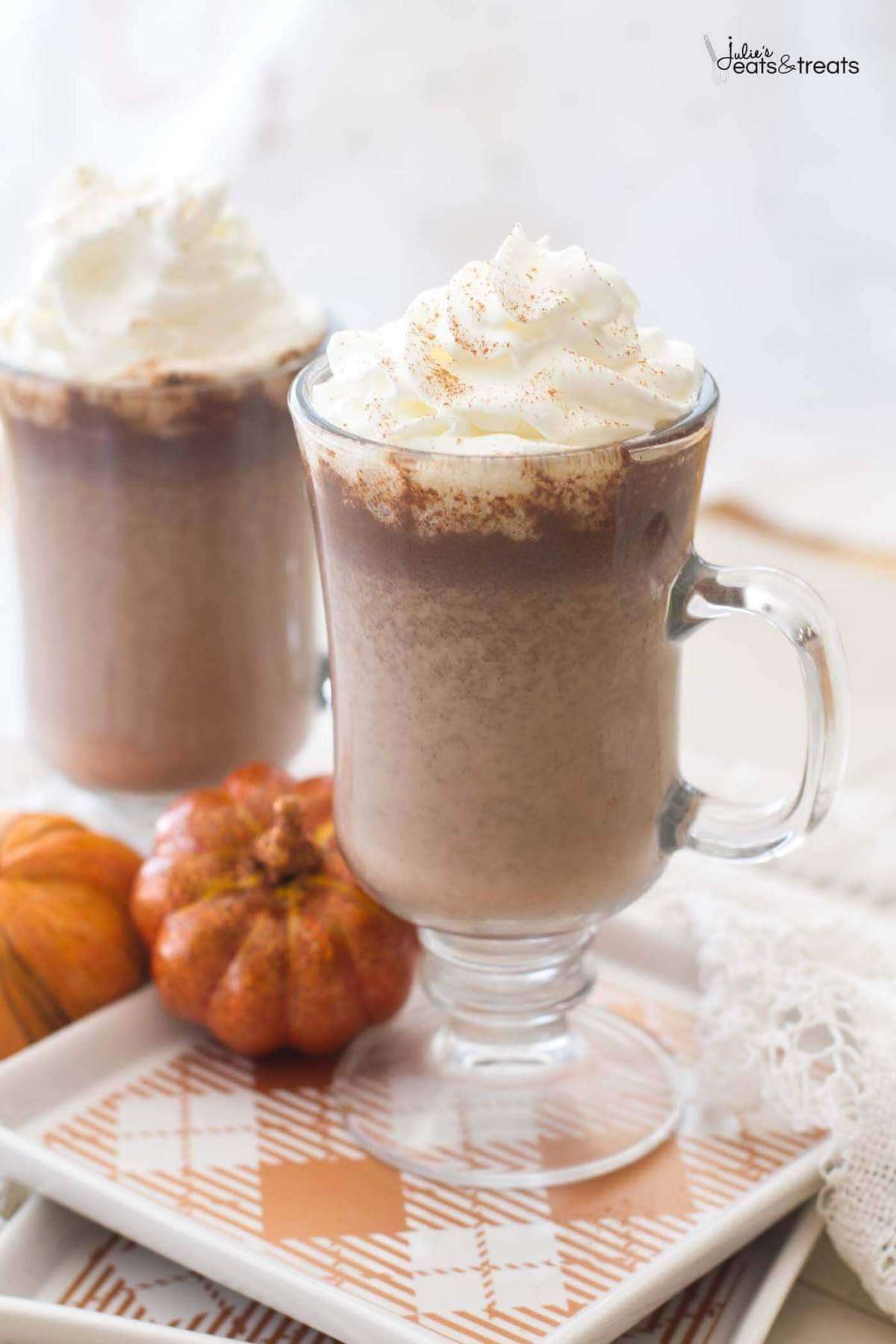 This homemade pumpkin hot chocolate recipe uses real pumpkin puree and pumpkin pie spices to add a fall spin to a classic drink!