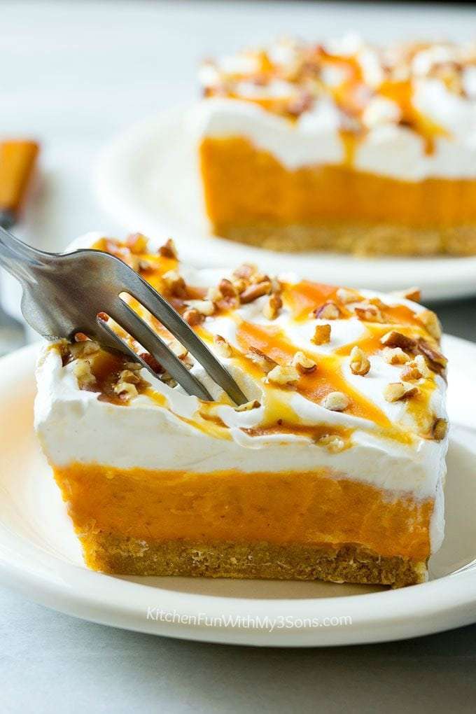 This easy no-bake pumpkin lush is layers of graham cracker crust, pumpkin pudding and whipped topping, all topped with caramel and pecans. The ultimate fall dessert!