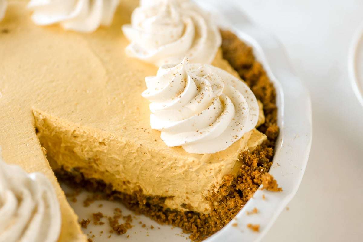 - When ready to serve garnish the top of the chilled pie with whipped cream or whipped topping and a sprinkle of grated nutmeg or pumpkin pie spice.