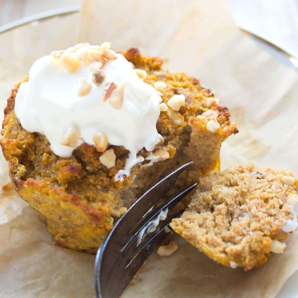 Pumpkin coconut flour muffins taste of spice and all things nice! These fluffy muffins are a wonderful grab & go breakfast or healthy sweet treat. Only 5 minutes prep and ready in 30 minutes!