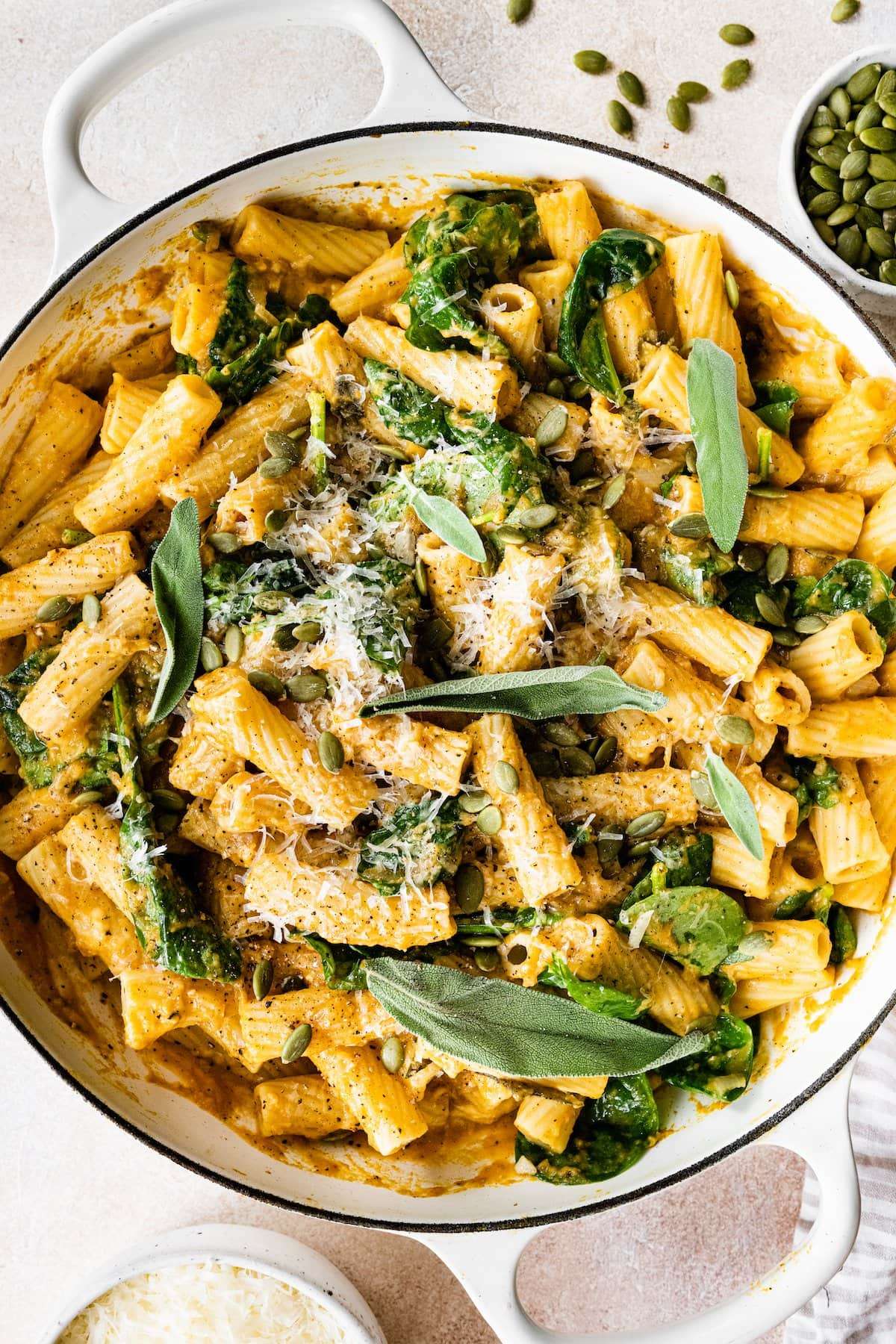 Cozy up this fall with a bowl of this pumpkin pasta. Cooked pasta is tossed in a creamy sauce made with pumpkin puree, brown butter and fresh sage leaves to create a delicious and comforting dinner that comes together in under 30 minutes.