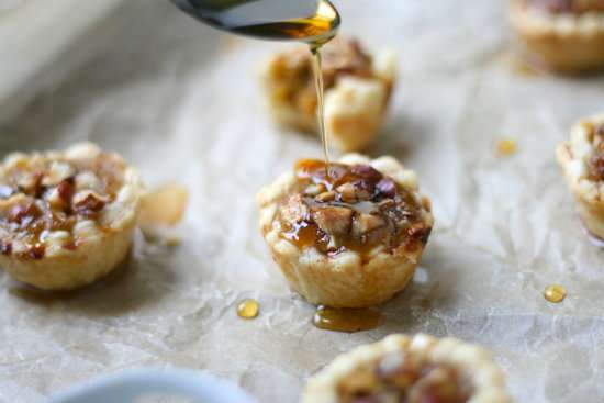 - Spoon 2 teaspoons of pumpkin filling into each pie crust cup then top with 1 teaspoon of pecan topping. Bake 35 minutes or until the filling has set. Remove tassies to a wire rack to cool. Drizzle with maple syrup when ready to serve.