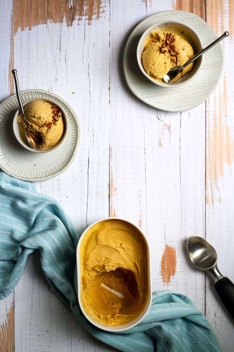 This creamy pumpkin pie ice cream is made with real pumpkin, cream cheese, brown sugar, maple syrup, and pumpkin spice for a delicious fall dessert! (No eggs!)