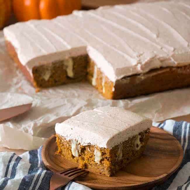 Pumpkin cake poked to heaven and back then filled with homemade vanilla pudding spiked with rum and topped in a spiced brown buttercream!