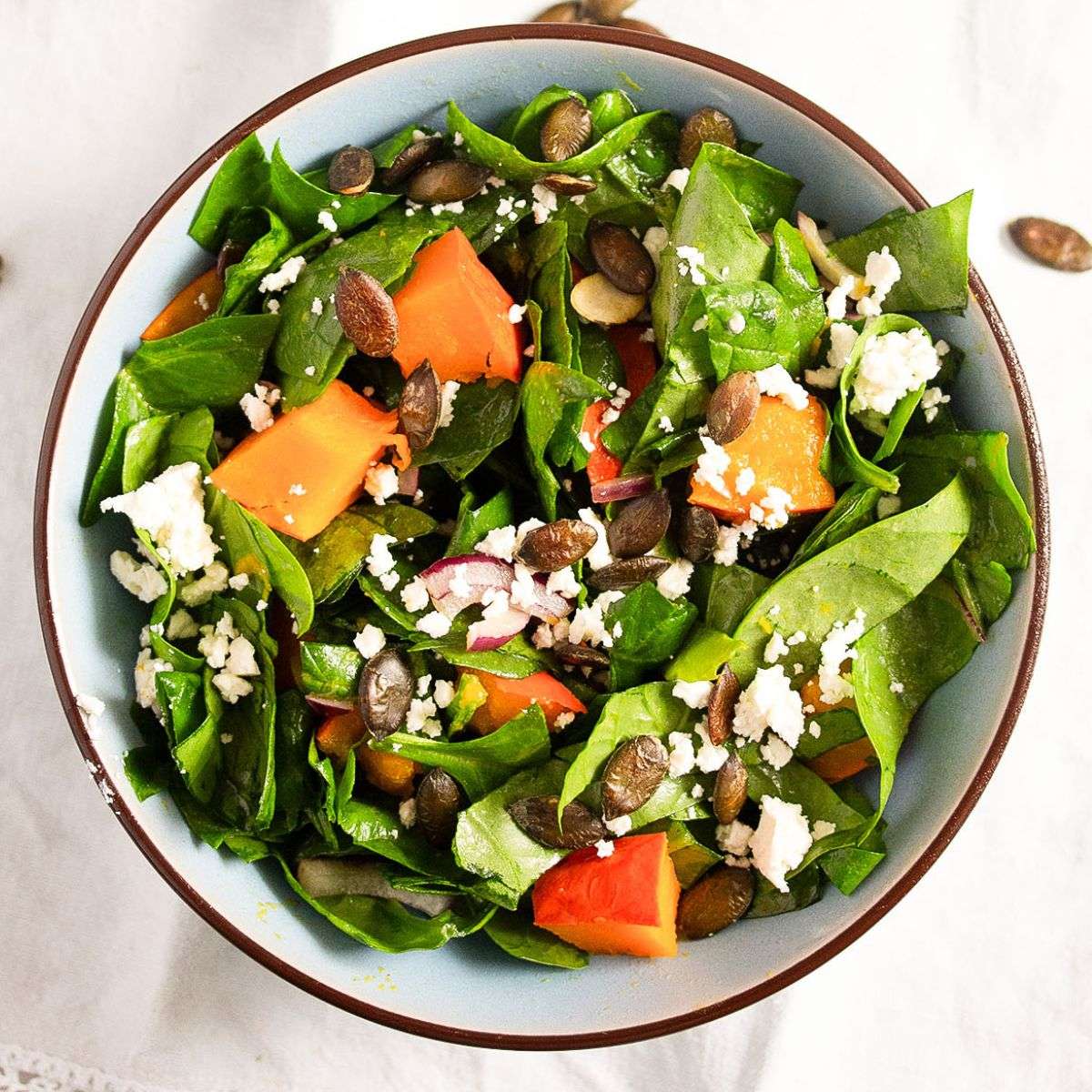 This pumpkin seed salad with roasted pumpkin, feta, and spinach is perfect as a light main or side dish, ideal for the season or Thanksgiving dinner.