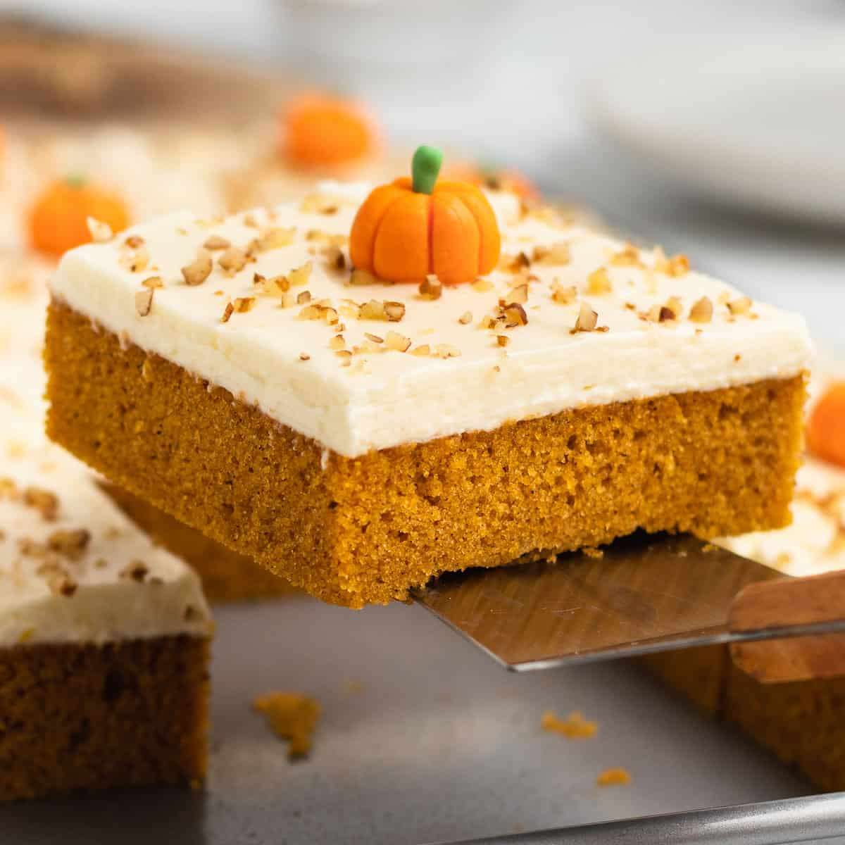 This Pumpkin Sheet Cake is full of sweet, fall flavors and finished off with a cream cheese icing. It’s easy to make and perfect for a crowd!