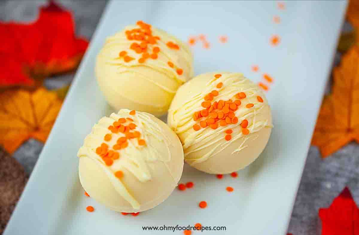 - When the white melted chocolate cools off, use a fork to drizzle the chocolate over the top of the pumpkin spice hot cocoa balls and sprinkle with some orange sprinkles on top. Repeat this step and finish decorating 6 of them.