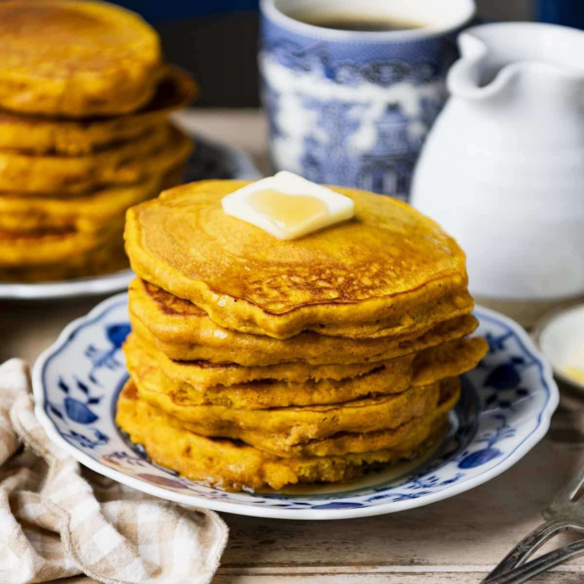 Pumpkin spice pancakes with a drizzle of warm apple cider syrup are a cozy fall breakfast!
