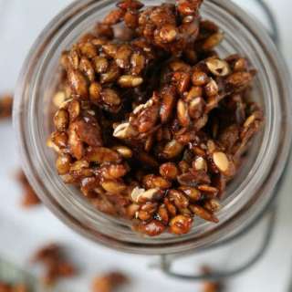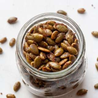 Homemade pumpkin spice pepitas sweetened with maple syrup and a little sea salt for the ultimate sweet and savory treat.
