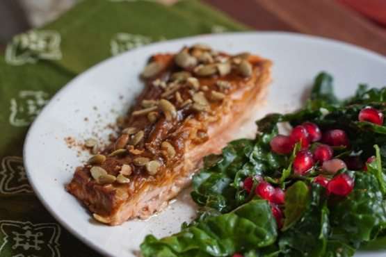 - Arrange salmon fillets, skin side down, in a single layer in a baking dish. Spread pumpkin glaze over the fish, coating evenly. Sprinkle a quarter of the pepitas over each fillet.
