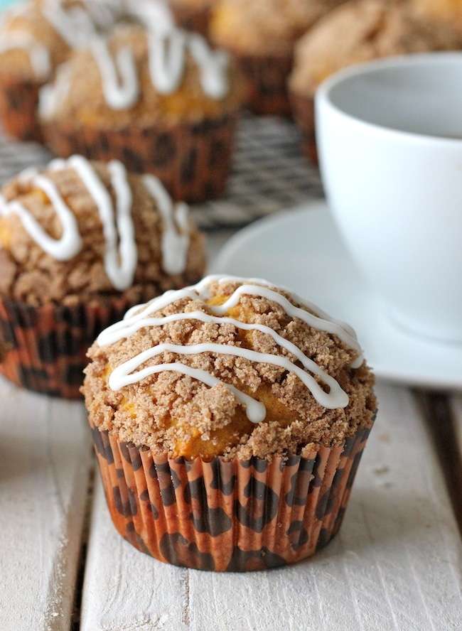 Pumpkin bread in muffin form with an oh-so-crumbly streusel topped with a drizzled vanilla glaze!