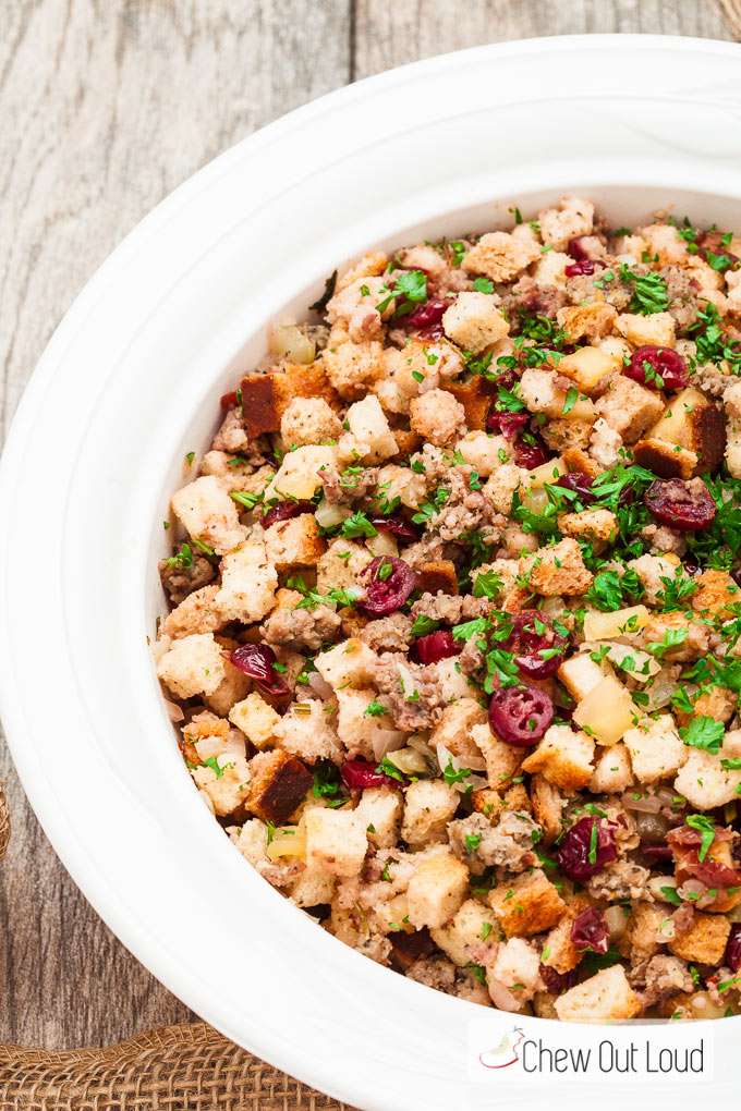 - In a large serving dish, combine browned/cooked sausage, cranberries, and seasoned bread cubes. Set aside.