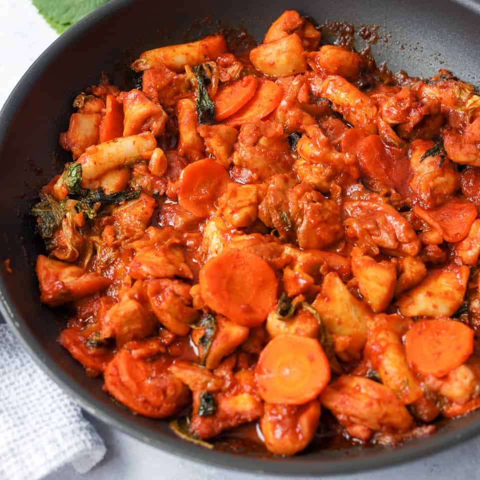 Tender juicy chicken stir fried in a spicy, smoky sweet gochujang sauce with carrots, cabbage, perilla leaves, rice cakes and onions. This quick and easy dak galbi is ready in 25 minutes with simple ingredients! A great main dish in Korean cuisine.