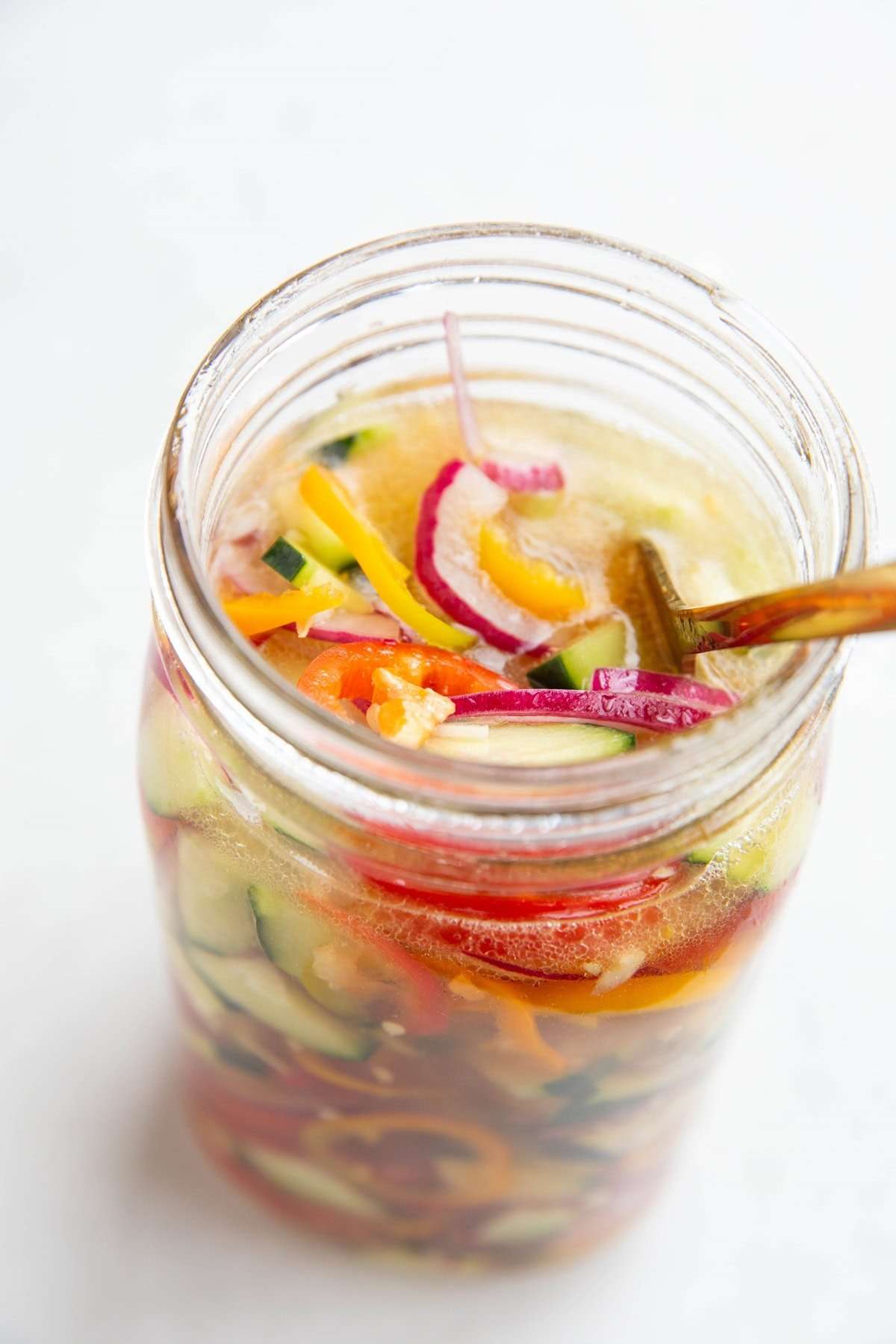 - Add all of the fresh vegetables to a large bowl or glass jar such as a mason jar and pour in the pickling liquid.