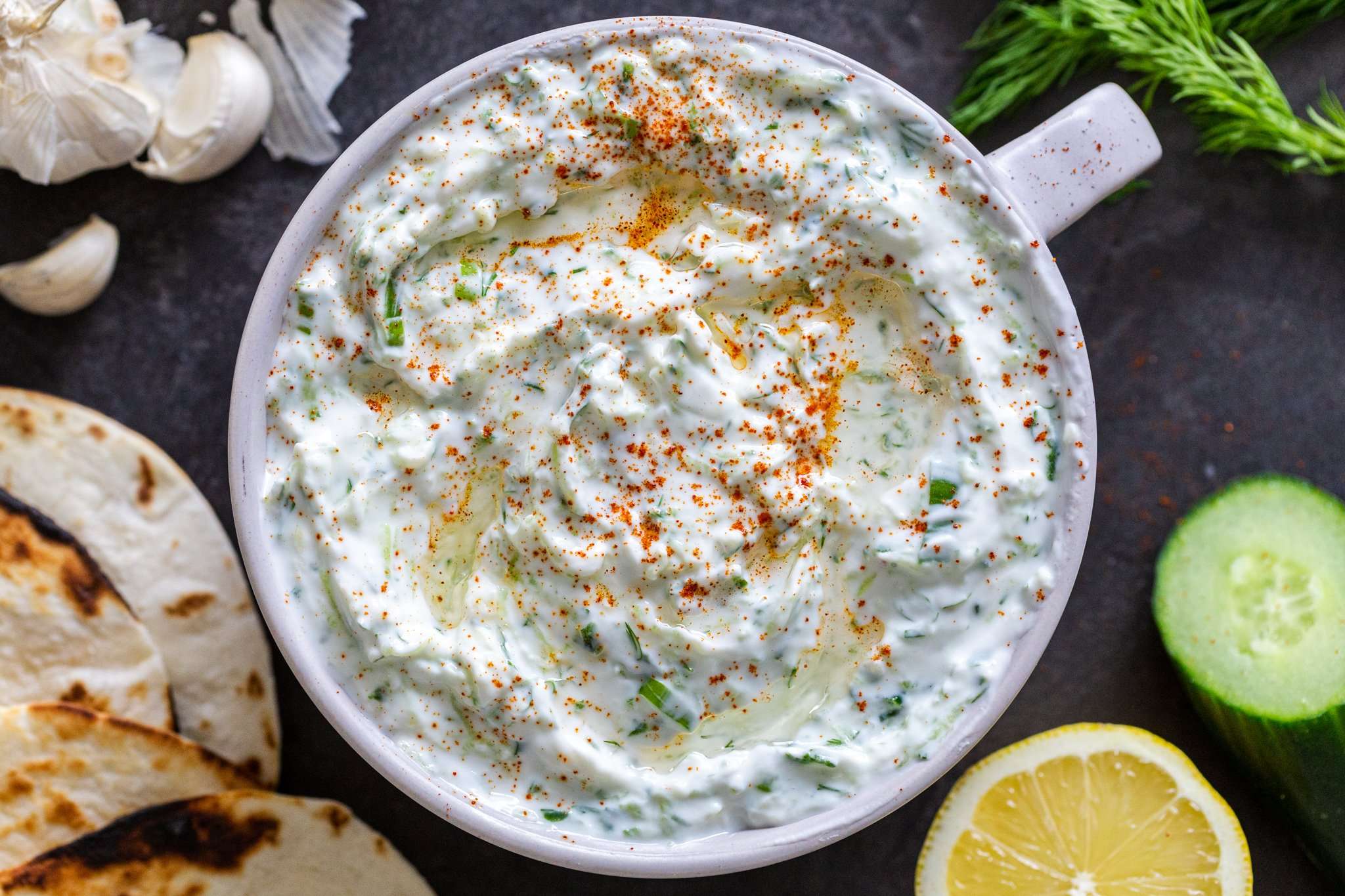- In a large bowl combine together, Greek yogurt, dill, cucumber, pressed garlic and juice from the lemon. Stir to combine together, season to taste.