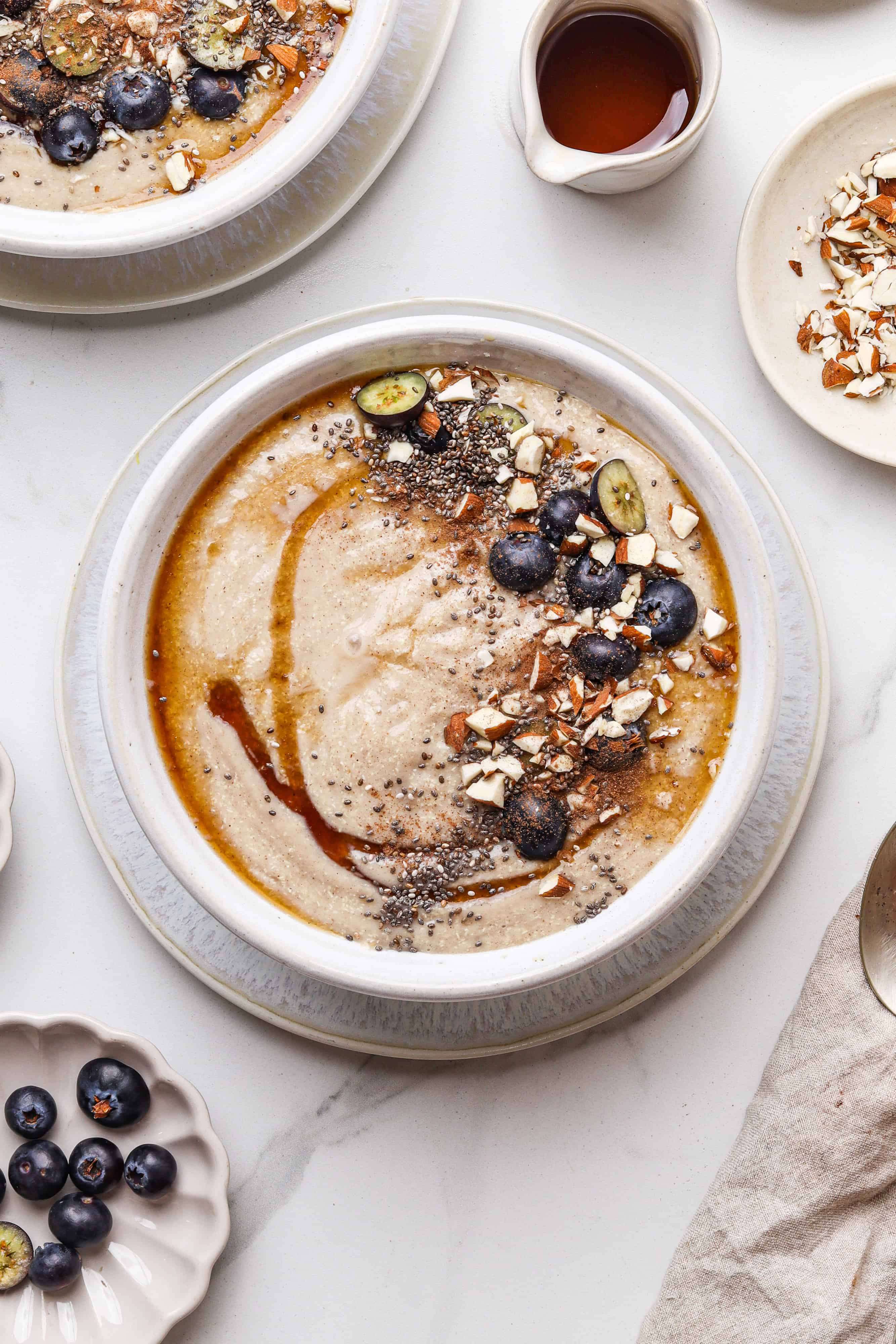 - Serve in bowls topped with a sprinkle of cinnamon and chia seeds. Top with fruit and nuts.
