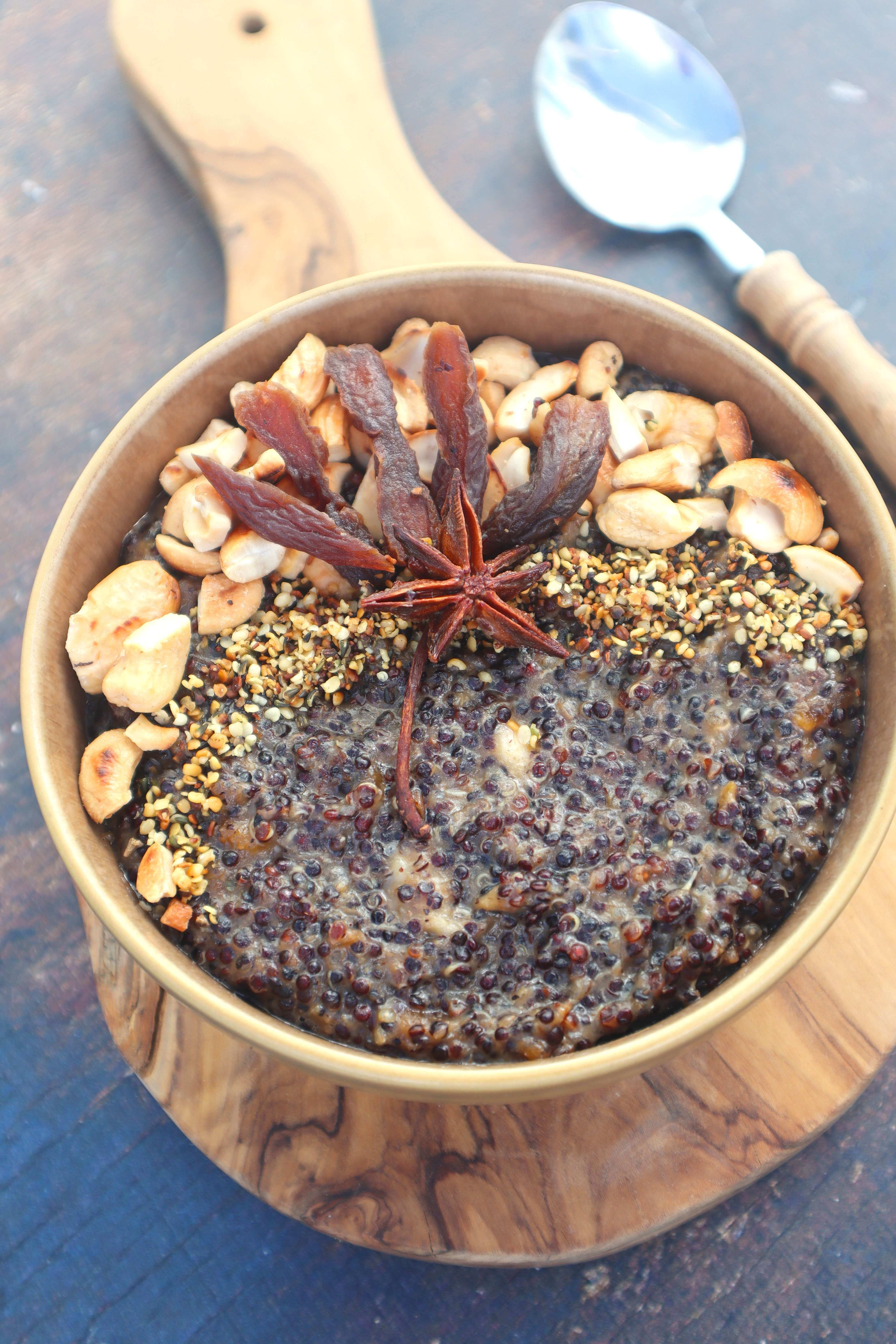 Delicious glutenfree and vegan porridge made with quinoa and banana. And a subtle sweetness of dried apricots. Deliciously spiced for autumn: with some star anise and fennel seeds.