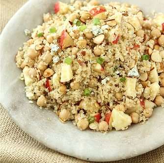- In a large bowl, mix together cooled quinoa, almonds, chickpeas, apple, Gorgonzola cheese and green onions.