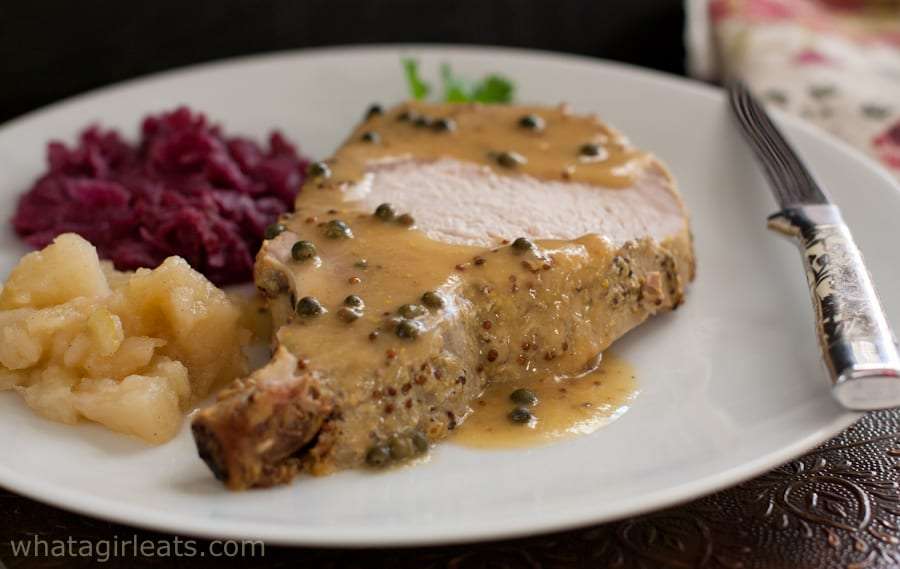 Roast rack of pork with green peppercorn sauce, from Emeril Lagasse. Serves 8 with leftovers