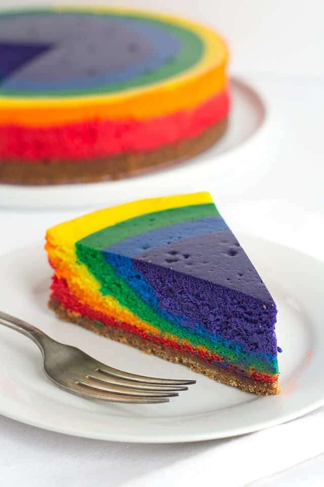 - Starting with the red, add the mixture into the center of the cheesecake. Then add the orange to the center of the cheesecake. Repeat adding the yellow, green, blue, and purple to the center of the cheesecake.