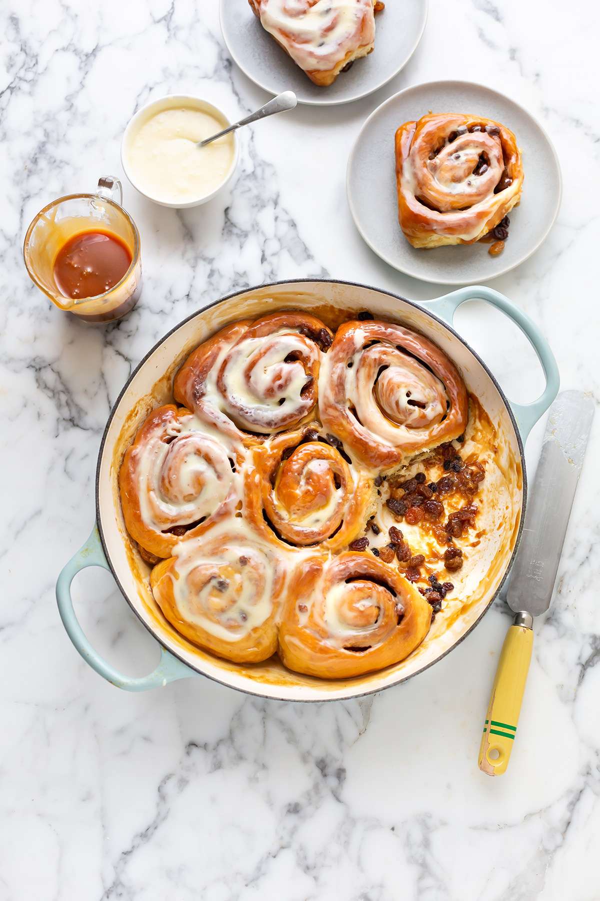 - Place the 16 cut slices of cinnamon rolls on top of the caramel and raisins, allowing some space in between for expansion during proving. Cover with a tea towel and allow to prove in a warm spot for about an hour.