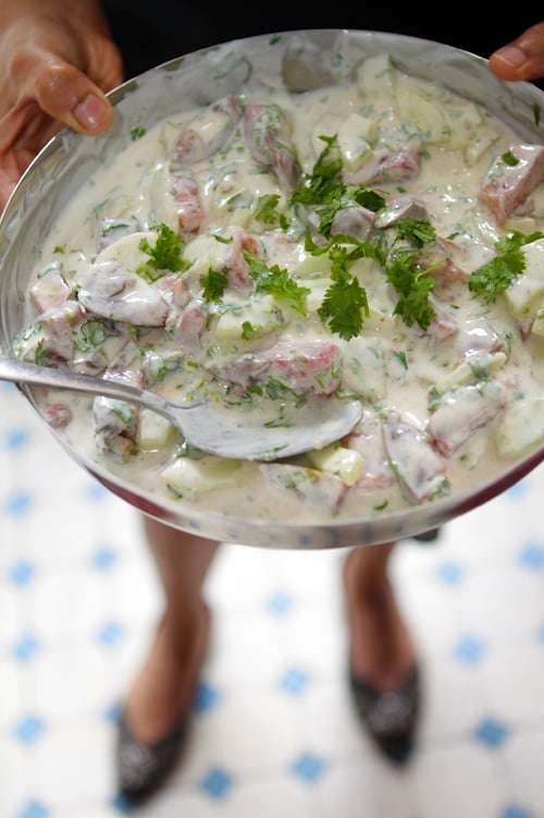 Beena used full-fat yogurt, but you could use lowfat yogurt in place of it if you really must. As mentioned above, raita can be made with a variety of fruits and vegetables, and you can dial up the flavors using mint, scallions or green onions, or whatever spices strike your fancy.