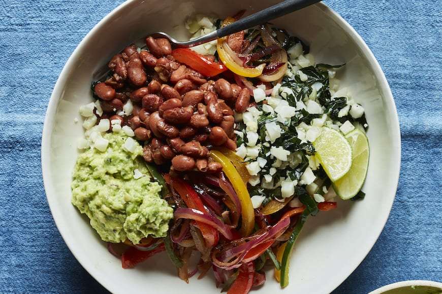 - Portion the Cauliflower rice into 4 serving bowls. Add a spoonful of the beans to each bowl and a spoonful of the fajita veggies. Top with plenty of guacamole and serve.