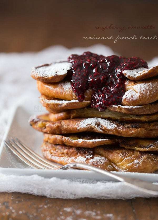 This raspberry amaretto croissant French toast is the perfect Valentine's Day breakfast. What could be better than buttery fried croissants topped with a sweet raspberry amaretto sauce?